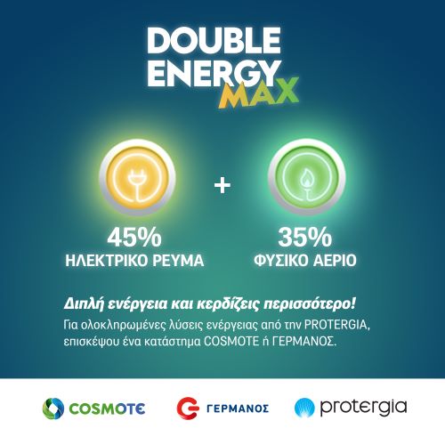 45% έκπτωση στους λογαριασμούς ηλεκτρικής ενέργειας και 35% στους λογαριασμούς φυσικού αερίου, προσφέρει, για 2 ολόκληρα χρόνια, η Protergia στους πελάτες που θα τα συνδυάσουν και είναι συνεπείς στην εξόφληση των λογαριασμών τους[1], μέσα από το Protergia Double Energy MAX, που διατίθεται στα καταστήματα COSMOTE και ΓΕΡΜΑΝΟΣ.