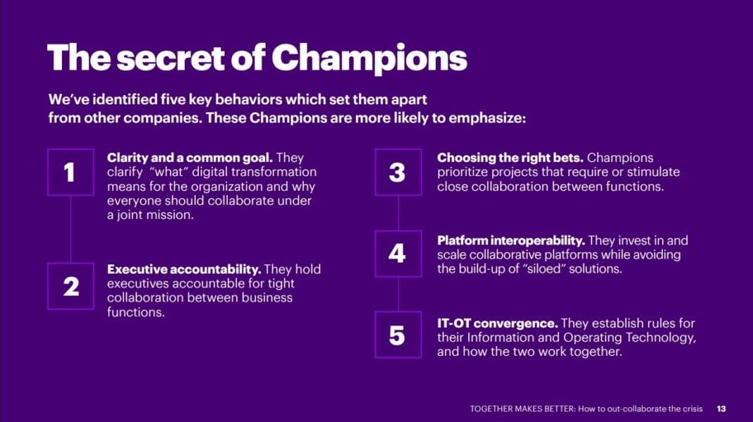 Ωστόσο, ένα μικρό ποσοστό των εταιρειών (22%), οι λεγόμενοι «πρωταθλητές», ξεχωρίζει όσον αφορά τον τρόπο εσωτερικής συνεργασίας για την επίτευξη μεγαλύτερης αξίας από τις ψηφιακές επενδύσεις. Πιο συγκεκριμένα, μεταξύ 2017 και 2019, αυτοί οι «πρωταθλητές» πέτυχαν αισθητά καλύτερα οικονομικά αποτελέσματα από την ψηφιοποίηση των επιχειρησιακών τους λειτουργιών, όπως: