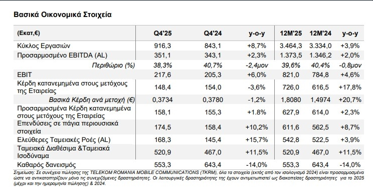 Ειδικότερα, τα έσοδα για το Δ’ τρίμηνο του 2025 ανήλθαν σε €916,3 εκατ., καταγράφοντας αύξηση 8,7% σε ετήσια βάση, κυρίως λόγω της ισχυρής ανόδου των εσόδων από System Solutions, της θετικής δυναμικής των υπηρεσιών λιανικής σταθερής και της επιτάχυνσης του ρυθμού ανάπτυξης στις υπηρεσίες κινητής.