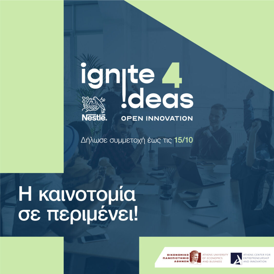 Η Nestlé Ελλάς, σε συνεργασία με το Κέντρο Επιχειρηματικότητας και Καινοτομίας (ACEin) του Οικονομικού Πανεπιστημίου Αθηνών, διοργανώνει για τέταρτη φορά το Πρόγραμμα Ανοικτής Καινοτομίας Ignite Ideas. Κύριοι στόχοι του προγράμματος είναι η προώθηση καινοτόμων ψηφιακών λύσεων αλλά και η στήριξη νέων επιχειρηματικών και ερευνητικών ομάδων, καθώς και νεοφυών επιχειρήσεων που αναπτύσσουν υπηρεσίες και προϊόντα.