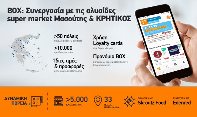 Τη συνεργασία του με τις αλυσίδες σούπερ μάρκετ «Μασούτης» και «ΚΡΗΤΙΚΟΣ» εγκαινιάζει το BOX, η υπηρεσία online παραγγελίας φαγητού της COSMOTE, δίνοντας για πρώτη φορά τη δυνατότητα στους καταναλωτές να παραγγέλνουν -με παράδοση ακόμα και αυθημερόν- όλα τα προϊόντα των συγκεκριμένων σούπερ μάρκετ, δηλαδή πάνω από 10.000 κωδικούς/αλυσίδα, σε συνολικά πάνω από 50 πόλεις της Ελλάδας. Επιπλέον, οι καταναλωτές μπορούν να απολαμβάνουν συνδυαστικά τα μοναδικά προνόμια του BOX μαζί με τα οφέλη από τα προγράμματα επιβράβευσης και τις προσφορές των αλυσίδων «Μασούτης» και «ΚΡΗΤΙΚΟΣ».