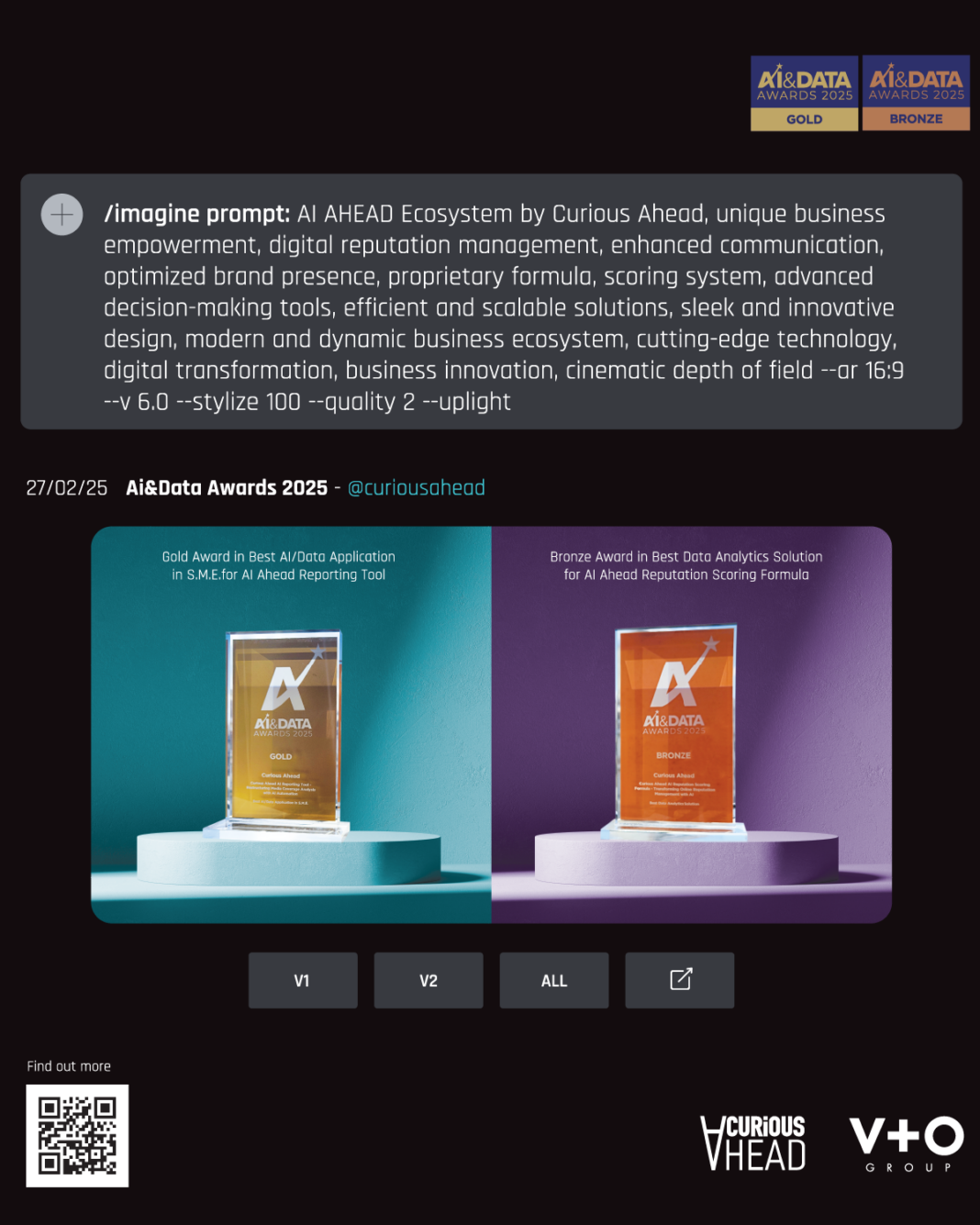 - Bronze βραβείο στην κατηγορία Best Data Analytics Solution για τo AI Ahead Reputation Scoring Formula, ένα AI-powered reputation scoring system, βασισμένο στην proprietary formula™ της Curious Ahead – μια πρωτοποριακή AI-driven μέθοδο αξιολόγησης και διαχείρισης ψηφιακής φήμης, που επιτρέπει στις επιχειρήσεις να κατανοούν δυναμικά τον αντίκτυπό τους και να λαμβάνουν στρατηγικές αποφάσεις βάσει δεδομένων.