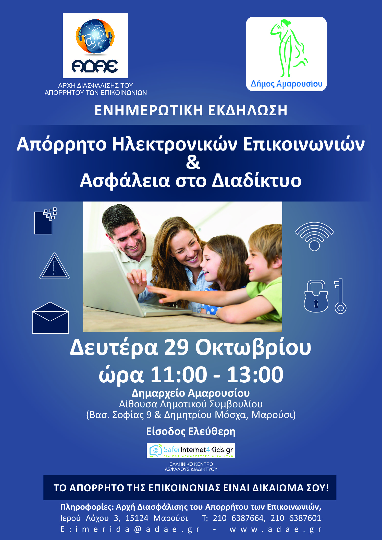 Στον φιλόξενο χώρο του Δημαρχείου Αμαρουσίου θα πραγματοποιηθεί ενημερωτική εκδήλωση της Αρχής Διασφάλισης του Απορρήτου των Επικοινωνιών (ΑΔΑΕ) με θέμα: «Απόρρητο Ηλεκτρονικών Επικοινωνιών και Ασφάλεια στο Διαδίκτυο» τη Δευτέρα 29 Οκτωβρίου 2018 και ώρα 11:00-13:00. Στην εκδήλωση συμμετέχει με ομιλία εκπρόσωπος του Ελληνικού Κέντρου Ασφαλούς Διαδικτύου (SaferInternet4kids), καθώς και εκπρόσωπος της Ελληνικής Εθνικής Ομάδας Κυβερνοασφάλειας, η οποία διακρίθηκε στον πρόσφατο Πανευρωπαϊκό Διαγωνισμό Κυβερνοασφάλειας (European Cybersecurity Challenge). Θα προλογίσουν ο Δήμαρχος Αμαρουσίου και ο Αντιπρόεδρος της ΑΔΑΕ.