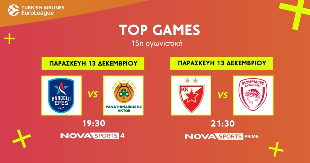 Η EuroLeague η κορυφαία ευρωπαϊκή διασυλλογική διοργάνωση στο χώρο του μπάσκετ συνεχίζεται με αμείωτο ενδιαφέρον και οι συνδρομητές της Nova ετοιμάζονται για τις αναμετρήσεις της 15ης αγωνιστικής Αναντολού Εφές – Παναθηναϊκός AKTOR (13/12, 19:30) & Ερυθρός Αστέρας – Ολυμπιακός (13/12, 21:30) στο παρκέ του Novasports.