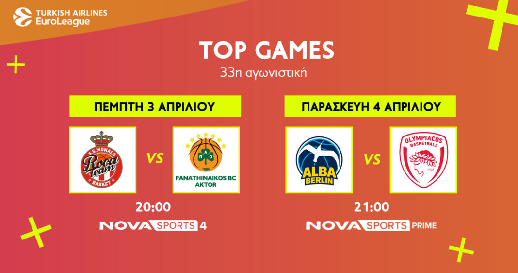 Η EuroLeague η κορυφαία ευρωπαϊκή διασυλλογική διοργάνωση στο χώρο του μπάσκετ, μπαίνει στην τελική ευθεία για την ολοκλήρωση της regular season και την κατάταξη των ομάδων εν όψει των Playoffs και οι συνδρομητές της Nova ετοιμάζονται να απολαύσουν τις αναμετρήσεις της 33ης και προτελευταίας αγωνιστικής Μονακό – Παναθηναϊκός AKTOR (3/4, 20:00) και Άλμπα Βερολίνου – Ολυμπιακός (4/4, 21:00) στο παρκέ του Novasports.