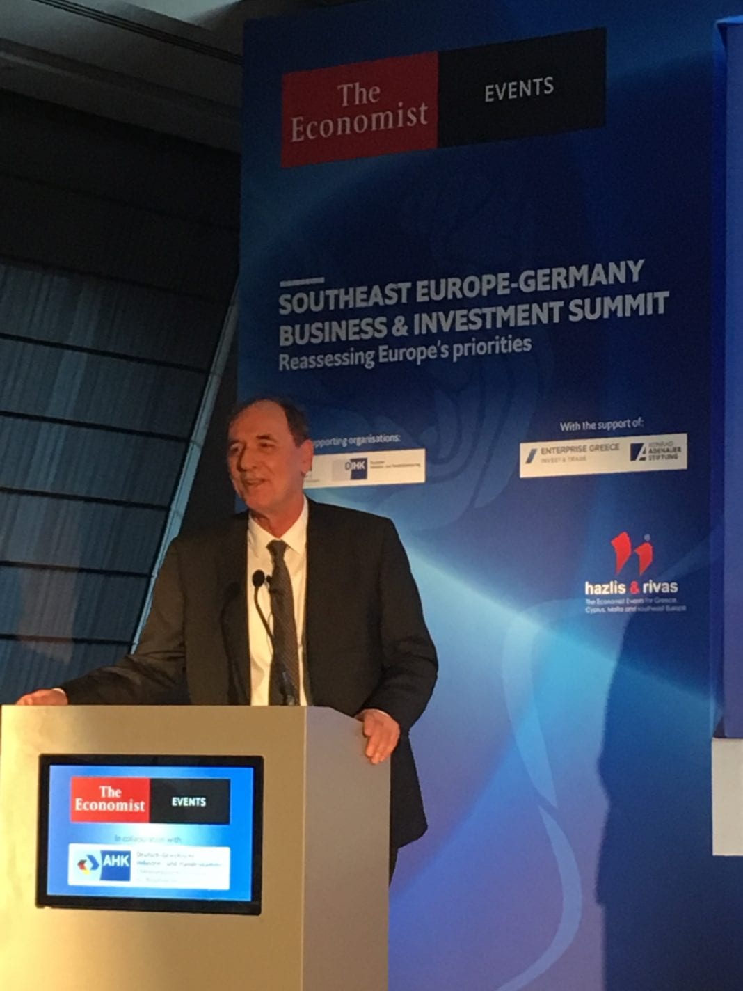 «Μετά από μια μεγάλη κρίση, η ανάπτυξη στην Ελλάδα επέστρεψε. Ο ρυθμός ανάπτυξης ξεπερνά ήδη το 2%, για πρώτη φορά από το 2007, και η ανεργία υποχώρησε κάτω από το 19%. Πλέον, η Ελλάδα είναι η σημαντικότερη νησίδα αισιοδοξίας στην Ευρώπη», υπογράμμισε ο Υπουργός Περιβάλλοντος και Ενέργειας, Γιώργος Σταθάκης, μιλώντας σήμερα σε συνέδριο που συνδιοργάνωσαν το περιοδικό Economist και το Ελληνογερμανικό Βιομηχανικό και Εμπορικό Επιμελητήριο, στο Βερολίνο.
