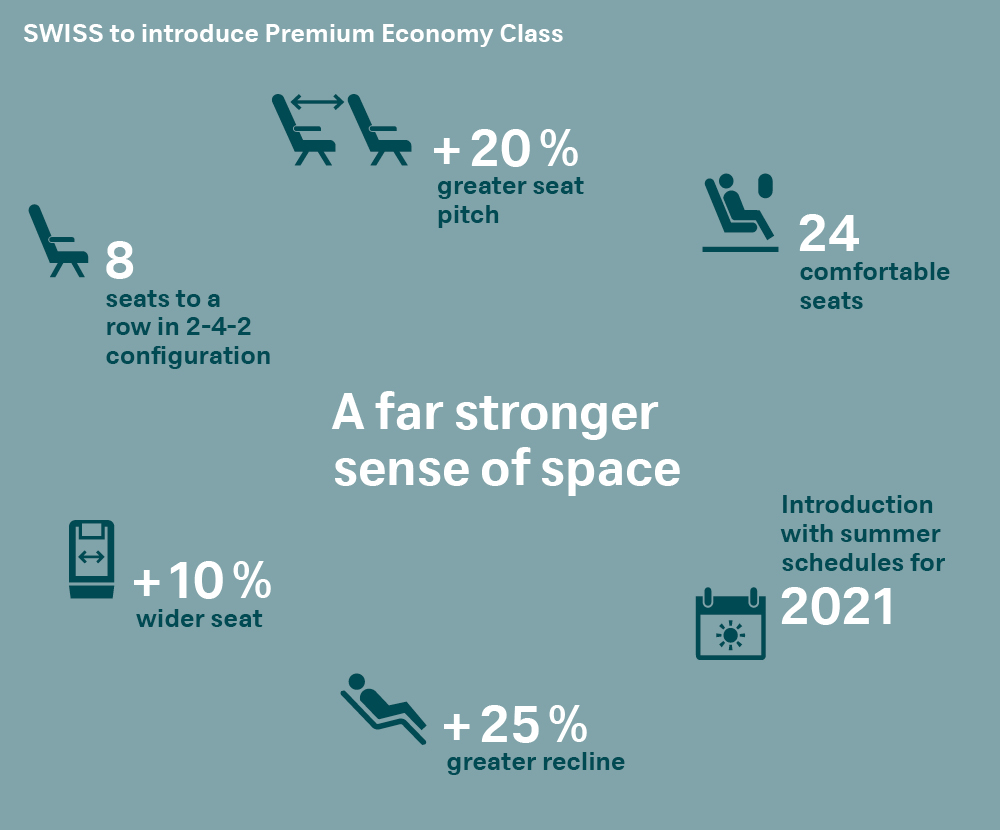 Η SWISS πρόκειται να παρουσιάσει μια νέα κατηγορία θέσης, την Premium Economy, η οποία θα είναι διαθέσιμη στα αεροσκάφη μεγάλων αποστάσεων από την άνοιξη του 2021, προκειμένου να ενισχύσει περαιτέρω τη θέση της εταιρίας ως Premium αερομεταφορέα. Αρχικά, η νέα κατηγορία θέσης θα περιλαμβάνει 24 καθίσματα στα αεροσκάφη Boeing 777-300ER. Σε δεύτερη φάση, η νέα θέση θα είναι διαθέσιμη σε όλο τον στόλο μεγάλων αποστάσεων της SWISS. Για τους επιβάτες της Economy που αναζητούν περισσότερη άνεση κατά τη διάρκεια της πτήσης, η νέα κατηγορία θέσης αναμένεται να προσφέρει μία ολοκαίνουργια ταξιδιωτική εμπειρία. Για την τοποθέτηση των καθισμάτων της νέας θέσης στα αεροσκάφη Boeing 777 η εταιρεία αναμένεται να επενδύσει περίπου 40 εκατομμύρια Ελβετικά φράγκα.
