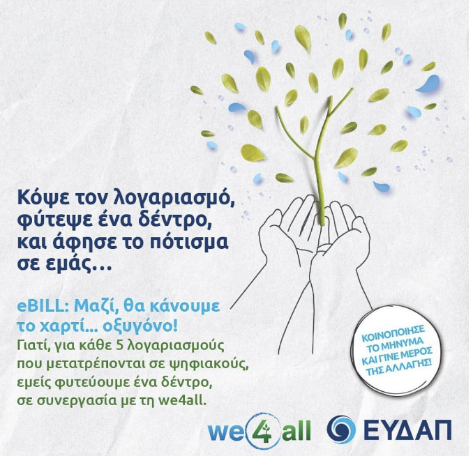 Για κάθε 5 λογαριασμούς που μετατρέπονται σε ψηφιακούς, η ΕΥΔΑΠ και η we4all φυτεύουν  ένα δέντρο, δίνοντας στο χαρτί .. πνοή! Η συμμετοχή στη δράση είναι πολύ απλή: ακολουθείς τον σύνδεσμο της ΕΥΔΑΠ και μετατρέπεις εύκολα και γρήγορα τον λογαριασμό σου σε ψηφιακό. Βοηθάς με την πιο απλή κίνηση τον πλανήτη και τα δάση μας και γίνεσαι μέρος της μεγαλύτερης και σημαντικότερης αλλαγής.