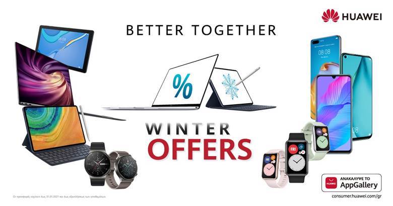 Αναλυτικά, οι χειμερινές προσφορές σε προιόντα Huawei, ανά κατηγορία. Αναζητήστε τις από 11 Ιανουαρίου έως και 31 Ιανουαρίου και μέχρι εξαντλήσεως των αποθεμάτων, στα καταστήματα: www.teleunicom.com, Cosmote, ΓΕΡΜΑΝΟΣ, ΚΩΤΣΟΒΟΛΟΣ, ΠΛΑΙΣΙΟ, Public, MediaMarkt, Vodafone, WIND, Electronet, You.gr, WelcomeStores, Euronics και Expert Hellas.