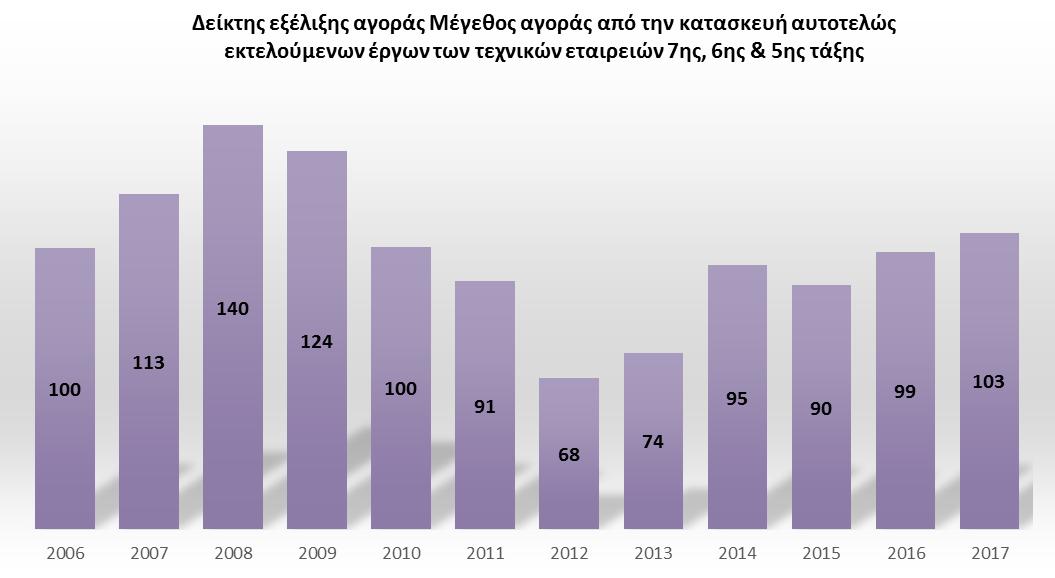 Ο κλάδος των κατασκευών κατέγραψε σημαντικές απώλειες την περίοδο 2008-2013. Εντούτοις από το 2014 η αγορά των τεχνικών εταιρειών φαίνεται να εισέρχεται σε τροχιά ανάκαμψης, λόγω κυρίως της “επανεκκίνησης” μεγάλων δημόσιων έργων, αλλά και της ενίσχυσης της εξωστρέφειας των επιχειρήσεων. Η ανάκαμψη της αγοράς αναστέλλεται το 2015, αλλά την διετία 2016-2017 ακολουθεί και πάλι ανοδικούς ρυθμούς κυρίως λόγω της αύξησης του κύκλου εργασιών των μεγάλων κατασκευαστικών εταιρειών / ομίλων από σημαντικά έργα υποδομών στην Ελλάδα αλλά και στο εξωτερικό.