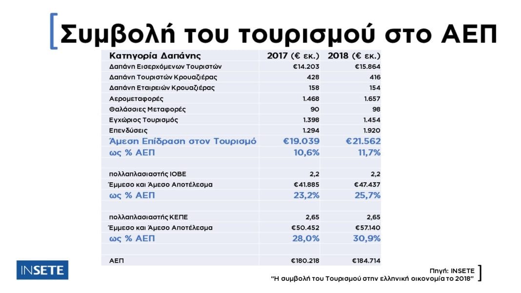 Αναλυτικά, η άμεση συνεισφορά του τουρισμού στο ΑΕΠ αυξήθηκε κατά 13,3% ή κατά 2,5 δισ. ευρώ σε σχέση με το 2017. Συνολικά (άμεσα και έμμεσα) ο τουρισμός το 2018 συνέβαλε από 25,7% (47,4 δισ. ευρώ) έως 30,9% (57,1 δισ. ευρώ) στη δημιουργία του ΑΕΠ.