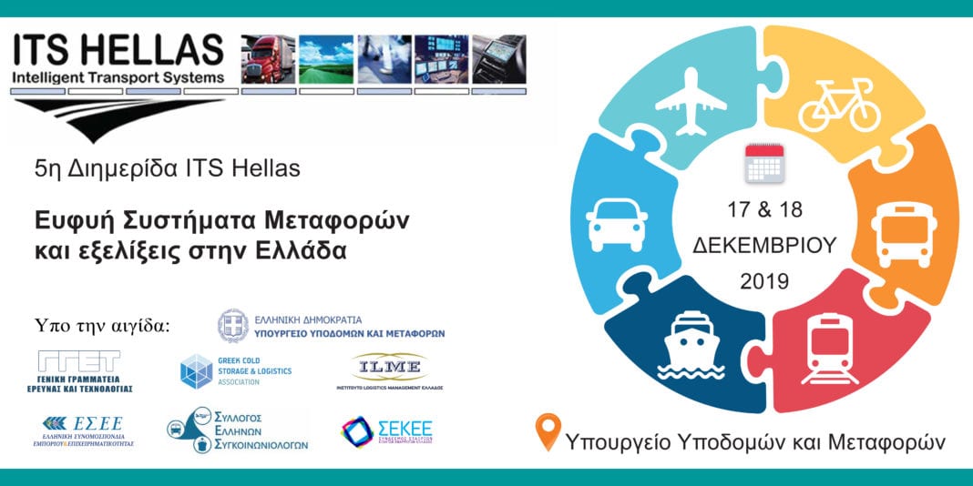 O Ελληνικός Οργανισμός Συστημάτων Ευφυών Μεταφορών – ITS Hellas, διοργανώνει την 5η Διημερίδα του με θέμα: «Ευφυή Συστήματα Μεταφορών και εξελίξεις στην Ελλάδα», η οποία θα πραγματοποιηθεί στις 17 και 18 Δεκεμβρίου 2019, στο Κεντρικό Αμφιθέατρο του Υπουργείου Υποδομών και Μεταφορών (Αναστάσεως 2 και Τσιγάντε, Τ.Κ. 156 69, Παπάγος, δίπλα στη στάση του μετρό “Εθνική Άμυνα”).