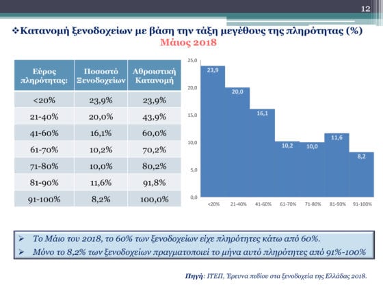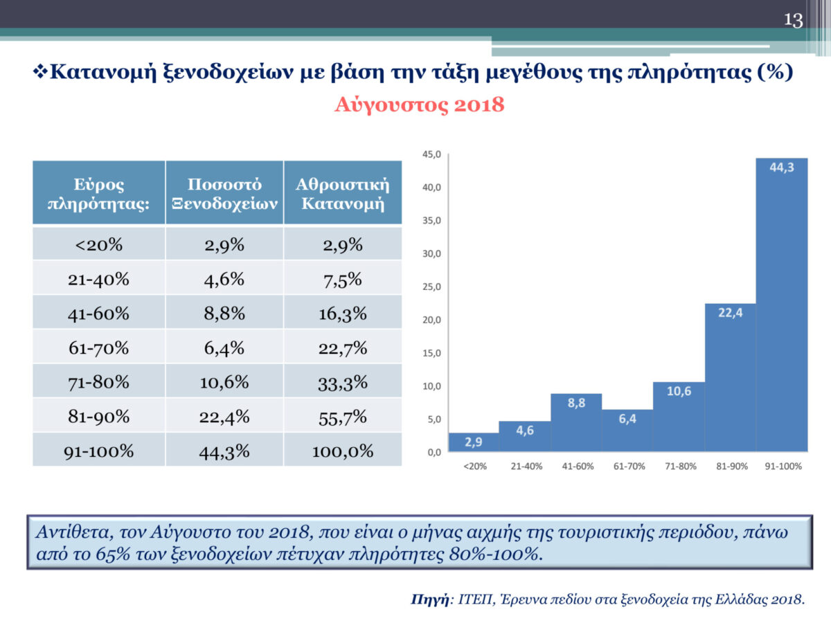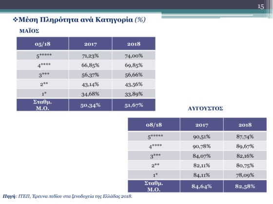 Τώρα σε ό,τι αφορά την εποχικότητα του ελληνικού τουρισμού αυτή εξακολουθεί να παραμένει υψηλή σύμφωνα με τις αφίξεις και διανυκτερεύσεις, επίσης αποτυπώνεται και στην κατανομή πληρότητας των ξενοδοχείων των Μάιο και τον Αύγουστο. Τον Μάιο το 60% των ξενοδοχείων έχει πληρότητας μέχρι 60% και τον Αύγουστο από το 65% των ξενοδοχείων έχει πληρότητα από 80% έως 100%.