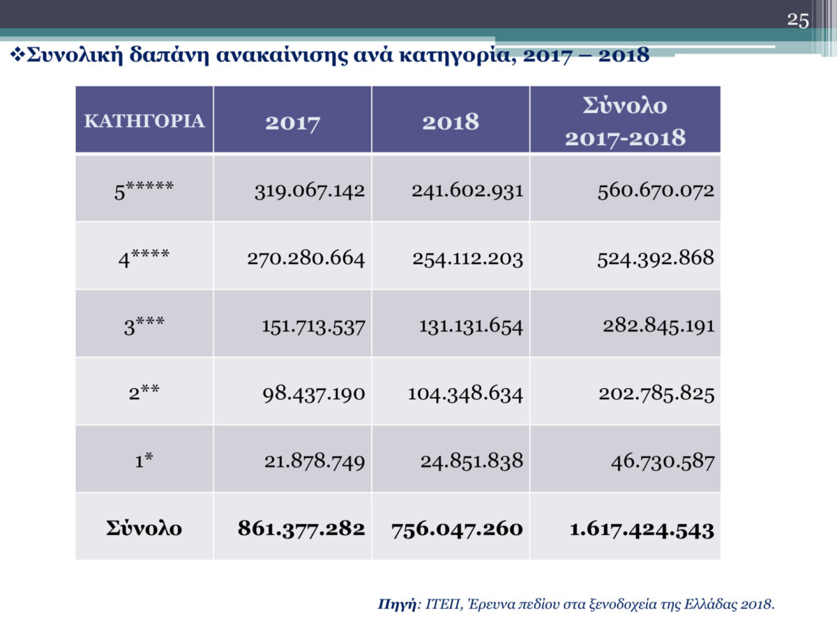 Ο μέσος όρος δαπάνης ανακαίνισης ανά δωμάτιο κυμαίνεται από 810 ευρώ στα ξενοδοχείο 1* και μέχρι 3.390 ευρώ στα ξενοδοχεία πέντε αστέρων. Το ποσοστό των εσόδων των ξενοδοχείων που δαπανάται για επισκευές / ανακαινίσεις κυμαίνεται από 10% για τα ξενοδοχεία πέντε αστέρων έως 19% για τα ξενοδοχείου ενός αστεριού