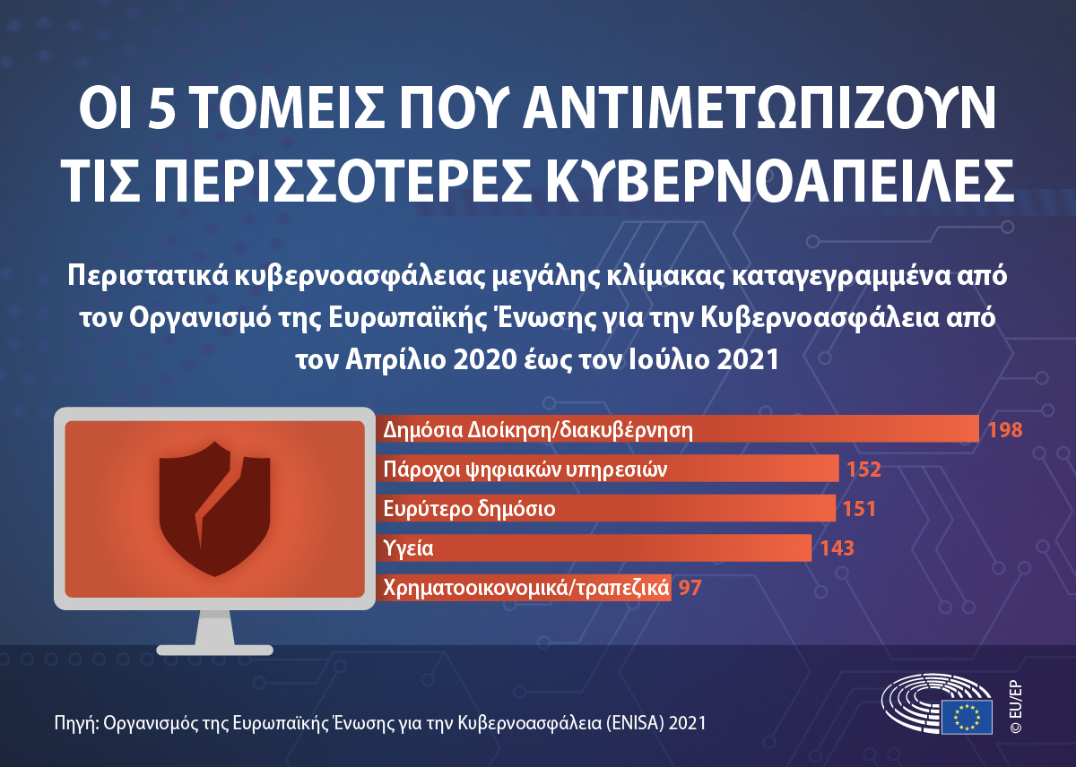 Από κλεμμένα δεδομένα έως μπλοκαρισμένα συστήματα νοσοκομείων: οι απειλές κατά της κυβερνοασφάλειας στην Ευρωπαϊκή Ένωση επηρέασαν τομείς ζωτικής σημασίας για την κοινωνία το 2021. Οι πέντε τομείς που αντιμετώπισαν το 2021 τις περισσότερες απειλές στον τομέα της κυβερνοασφάλειας ήταν η δημόσια διοίκηση και διακυβέρνηση, οι πάροχοι ψηφιακών υπηρεσιών, το ευρύτερο δημόσιο, η υγεία και τα χρηματοοικονομικά.