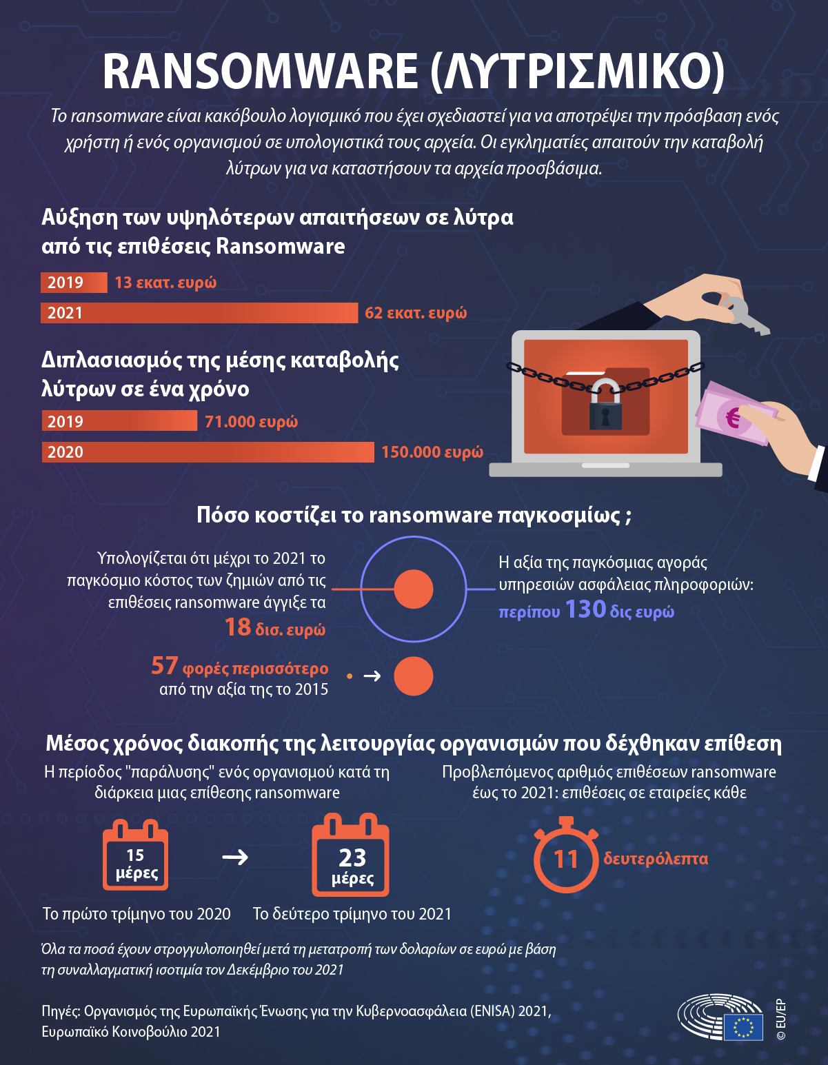 Σύμφωνα με τα στοιχεία του Οργανισμού της ΕΕ για την Κυβερνοασφάλεια, τα ποσά που ζητήθηκαν στο πλαίσιο της καταβολής λύτρων αυξήθηκαν από τα 13 εκατ. ευρώ το 2019 στα 62 εκατ. ευρώ το 2021. Επίσης, ο μέσος όρος καταβολής λύτρων διπλασιάστηκε από 71.000 ευρώ το 2019 στα 150.000 ευρώ το 2021.