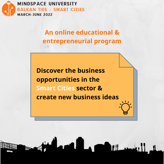 Είναι μια σειρά εντατικών webinars 4 εβδομάδων, ψηφιακών τάξεων, mentoring και πρόσωπο με πρόσωπο δικτύωσης για νέους ανθρώπους σε Ελλάδα, Κροατία, Αλβανία, Βουλγαρία, Βόρεια Μακεδονία, Ρουμανία, Πολωνία και Μαυροβούνιο με σκοπό να μάθεις τις επιχειρηματικές προκλήσεις και ευκαιρίες στον τομέα των Smart Cities, και να προπονηθείς στην δημιουργία επιχειρηματικών ιδεών δίπλα σε επιχειρηματίες από τη Silicon Valley, την Ελλάδα και τα Βαλκάνια.