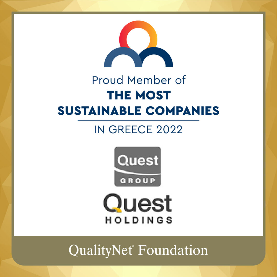 Ο Όμιλος Quest συγκαταλέγεται για άλλη μία χρονιά στους Ελληνικούς Οργανισμούς που εντάσσονται στην ηγετική ομάδα των «The Most Sustainable Companies in Greece 2022», σύμφωνα με τα ετήσια αποτελέσματα αξιολόγησης των επιχειρηματικών επιδόσεων στη Βιώσιμη Ανάπτυξη με βάση τα ESG κριτήρια, που ανακοίνωσε το QualityNet Foundation.