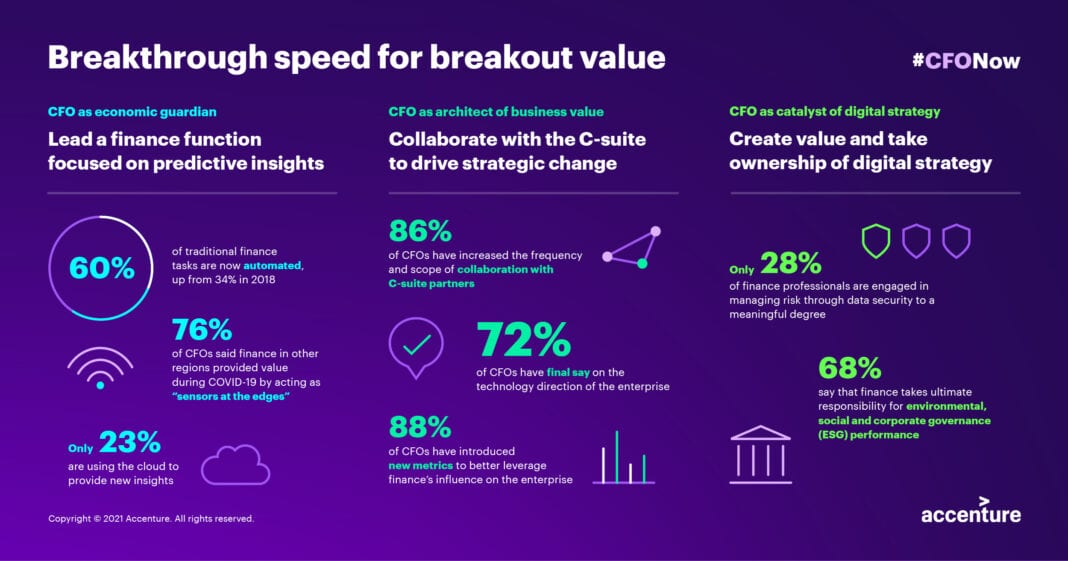 Σύμφωνα με τη μελέτη “CFO Now: Breakthrough Speed for Breakout Value” διαπιστώνεται ότι πέρα από την πανδημία, άλλες εξωτερικές προκλήσεις, όπως η ψηφιοποίηση, η δυναμική της αγοράς και οι ταχέως εξελισσόμενες προσδοκίες των καταναλωτών έχουν ωθήσει τους CFOs να διευρύνουν και να μετασχηματίσουν το ρόλο τους. Οι CFOs καλούνται πλέον να διασφαλίσουν ότι η επιχείρησή τους διαμοιράζει και μειώνει τον κίνδυνο με κατάλληλο τρόπο, απαντώντας σε θέματα αναφορικά με το περιβάλλον, την κοινωνία και την εταιρική διακυβέρνηση (ESG), αλλά και σε θέματα ασφάλειας που αντιμετωπίζουν οι επιχειρήσεις τους.