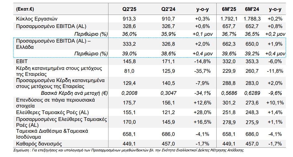 Το προσαρμοσμένο EBITDA (AL) του Ομίλου ανήλθε σε €328,6 εκατ., αυξημένο κατά 0,6%, αντικατοπτρίζοντας την ανάπτυξη κατά 2,0% στην Ελλάδα.