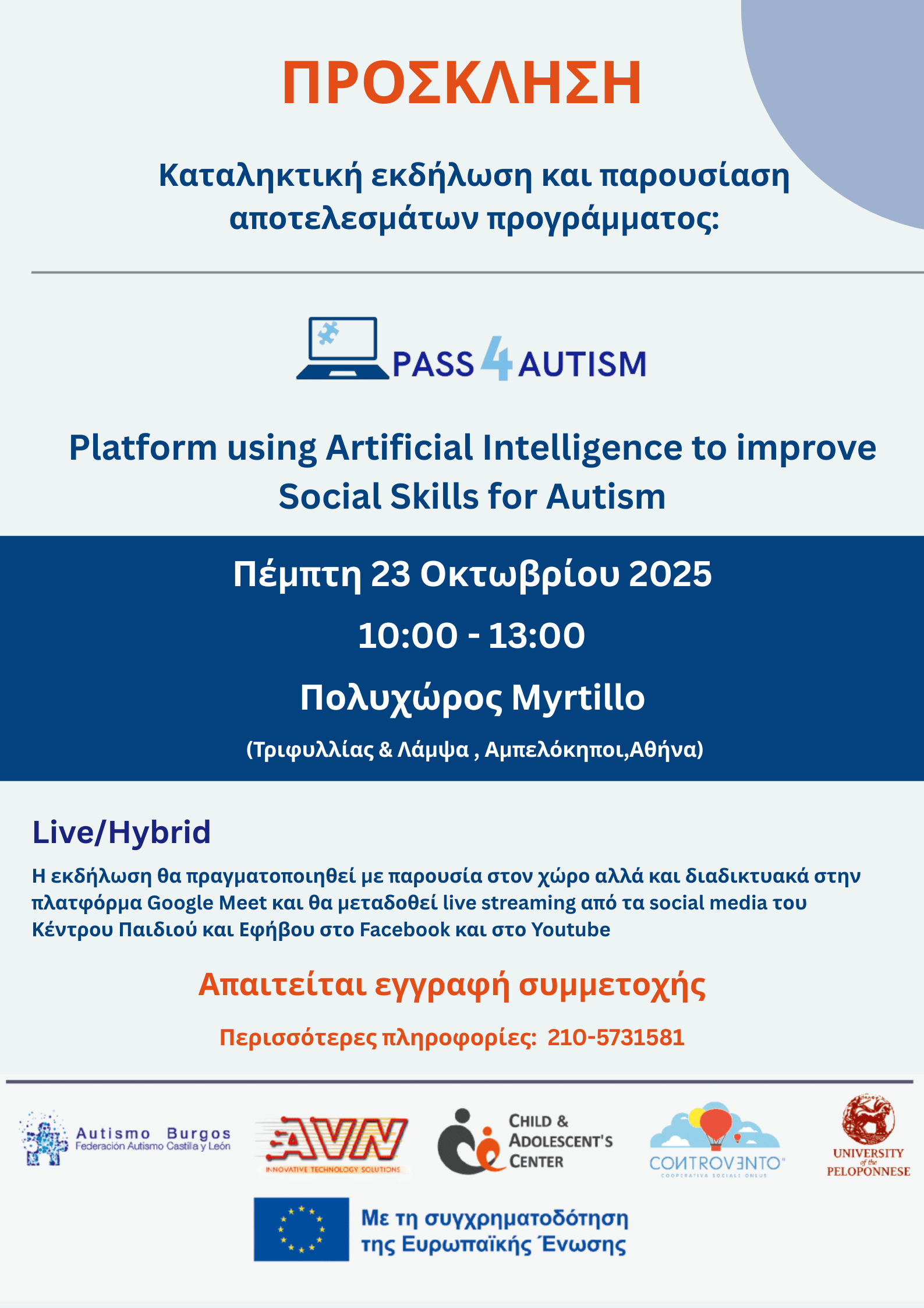Η καταληκτική εκδήλωση του έργου θα πραγματοποιηθεί την Πέμπτη 23 Οκτωβρίου, από 10:00 έως 13:00, στον Πολυχώρο Myrtillo (Τριφυλίας & Λάμψα, Αμπελόκηποι, Αθήνα), καθώς και διαδικτυακά.