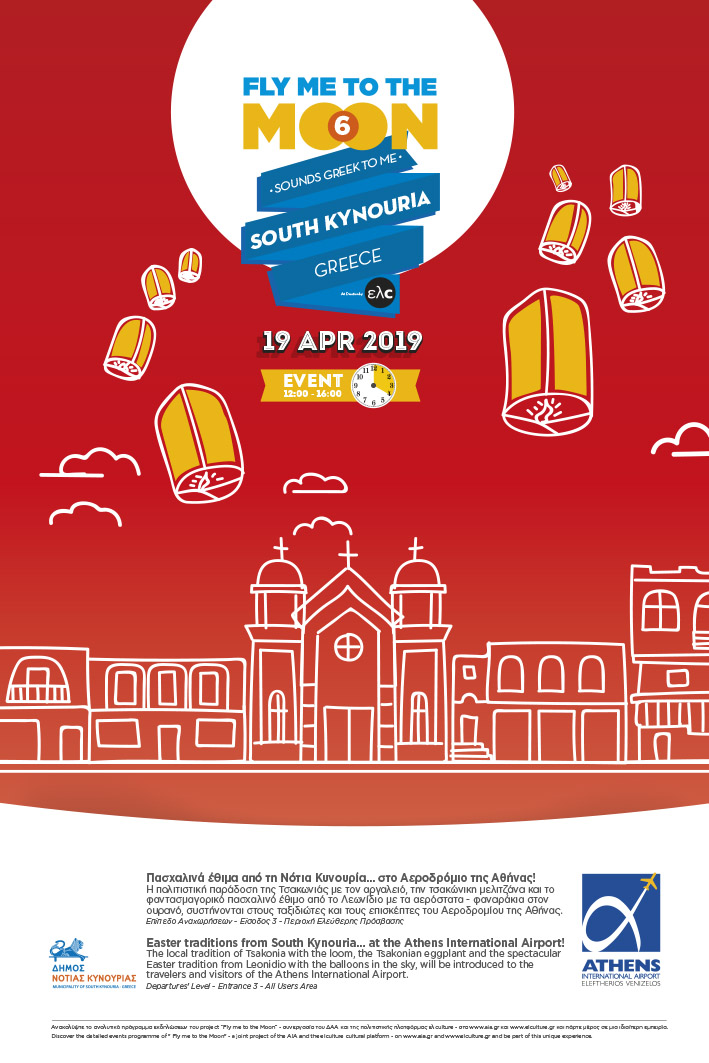 H Νότια Κυνουρία είναι ο έβδομος προορισμός του προγράμματος Fly me to the Moon – Sounds Greek to Me!  Η πολιτιστική παράδοση της Τσακωνιάς με τον αργαλειό, την τσακώνικη μελιτζάνα και το φαντασμαγορικό πασχαλινό έθιμο από το Λεωνίδιο με τα αερόστατα – φαναράκια στον ουρανό, συστήνονται στους ταξιδιώτες και τους επισκέπτες του αεροδρομίου, την Παρασκευή 19 Απριλίου.