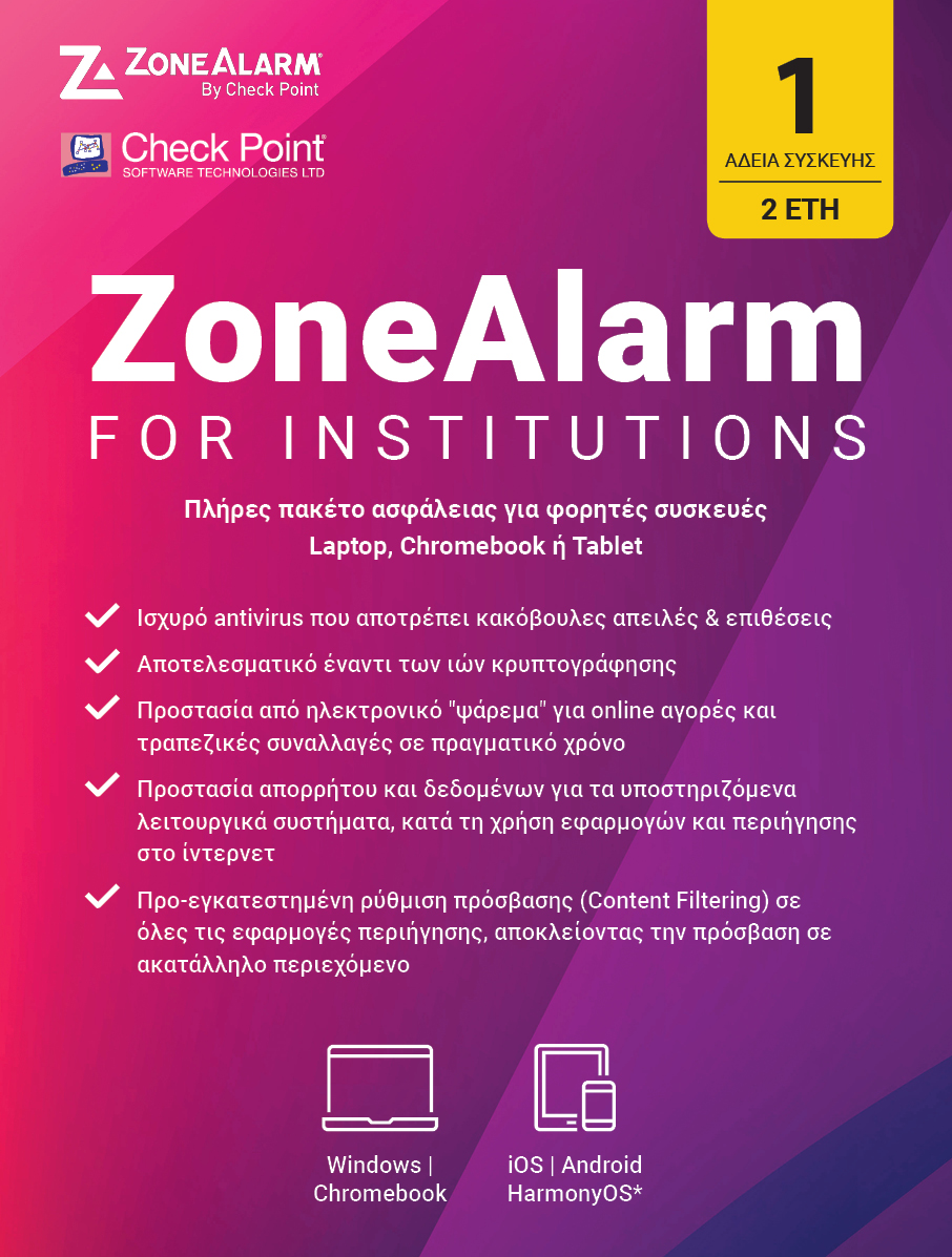 Συγκεκριμένα, το ZoneAlarm είναι ένα Antivirus το οποίο εμπιστεύονται εκατομμύρια χρήστες σε όλο τον κόσμο καθημερινά για να προστατευτούν από απειλές στον κυβερνοχώρο. Μέσω του προγράμματος “Ψηφιακή Μέριμνα”, οι φοιτητές και οι μαθητές μπορούν να εξοπλίσουν τον υπολογιστή ή το tablet τους με την κορυφαία λύση προστασίας, με την ίδια τεχνολογία που παρέχει η Check Point Software Technologies σε εταιρικούς πελάτες.
