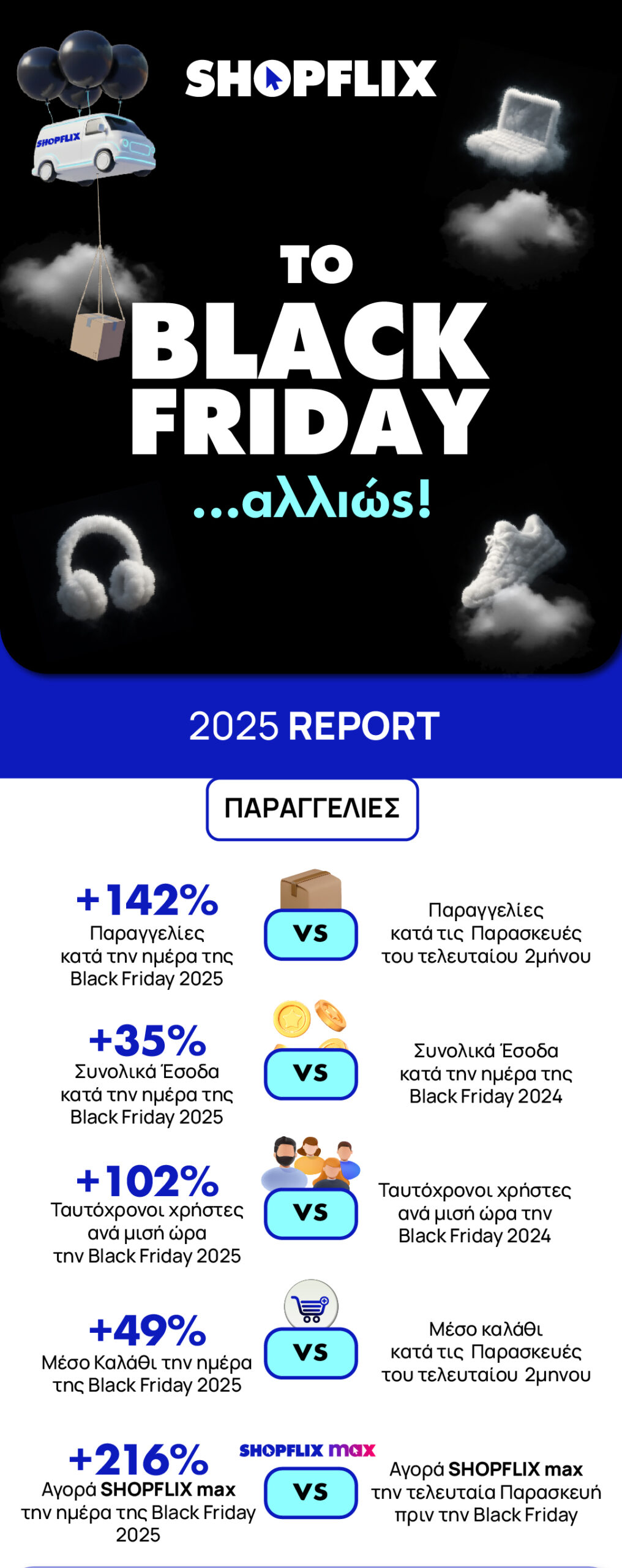 - Τα συνολικά έσοδα του SHOPFLIX (GMV) σημείωσαν 35% αύξηση την ημέρα της Black Friday 2025 σε σχέση με την περσινή αντίστοιχη μέρα.