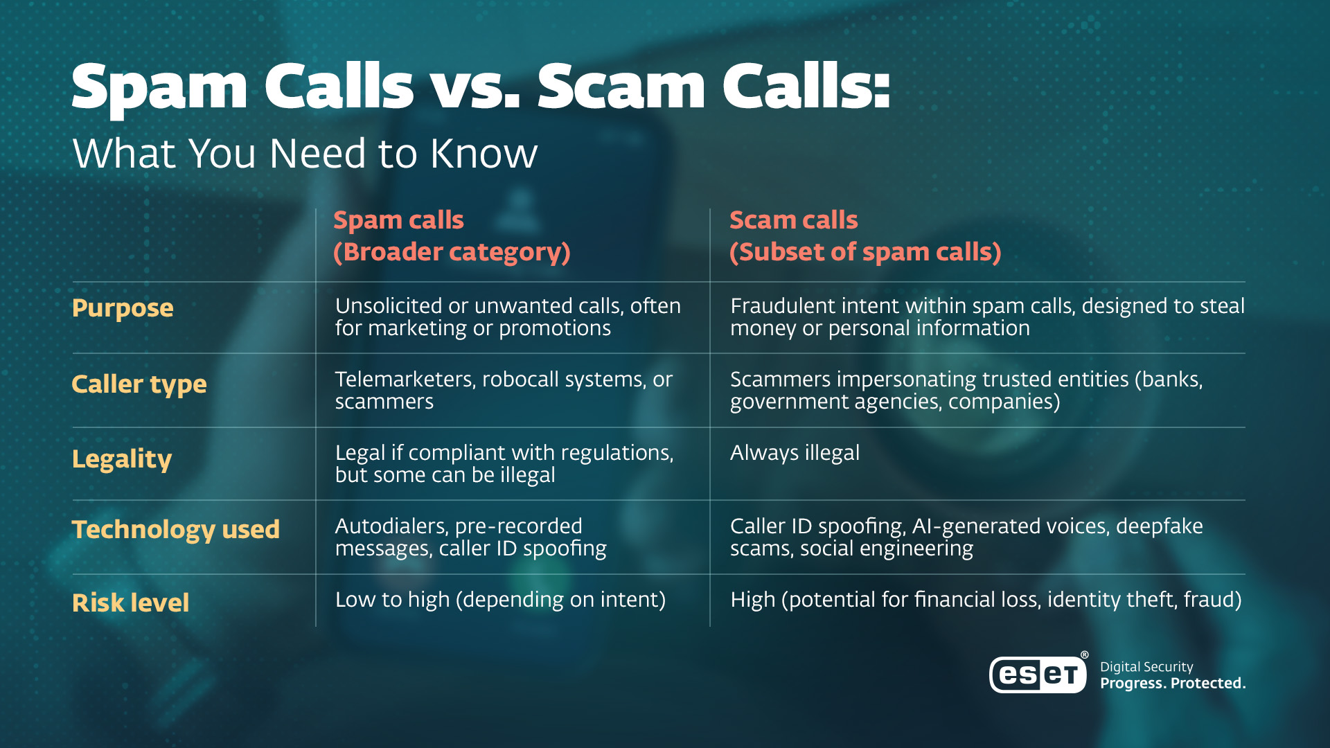 • Robocalls: αυτοματοποιημένα μηνύματα που μπορεί να έχουν νόμιμους σκοπούς (π.χ. υπενθυμίσεις ραντεβού ή ανακοινώσεις δημόσιας ωφέλειας), αλλά συχνά χρησιμοποιούνται ως μέσο εξαπάτησης.