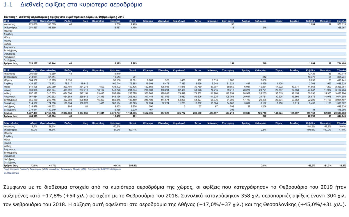 Σύμφωνα με την “Επισκόπηση των Εξελίξεων Μάρτιος 2019” του ΙΝΣΕΤΕ στα κυριότερα αεροδρόμια καταγράφηκε αύξηση των διεθνών αφίξεων από 304 χιλ. σε 358 χιλ. (+17,8%). Αύξηση παρατηρήθηκε τόσο στην Αθήνα από 215 χιλ. σε 252 χιλ. (+17,0%), όσο και στα περιφερειακά αεροδρόμια (κυρίως Θεσσαλονίκη) από 89 χιλ. σε 107 χιλ. (+19,6%). Στο διάστημα Ιανουαρίου – Φεβρουαρίου του 2019 στον Διεθνή Αερολιμένα Αθηνών καταγράφηκαν 523 χιλ. αφίξεις (+12,5%/+58 χιλ.) και στα περιφερειακά αεροδρόμια 211 χιλ. αφίξεις (+17,4%/+31 χιλ.) και στα περιφερειακά αεροδρόμια 211 χιλ. αφίξεις (+17,4%/+31 χιλ.).