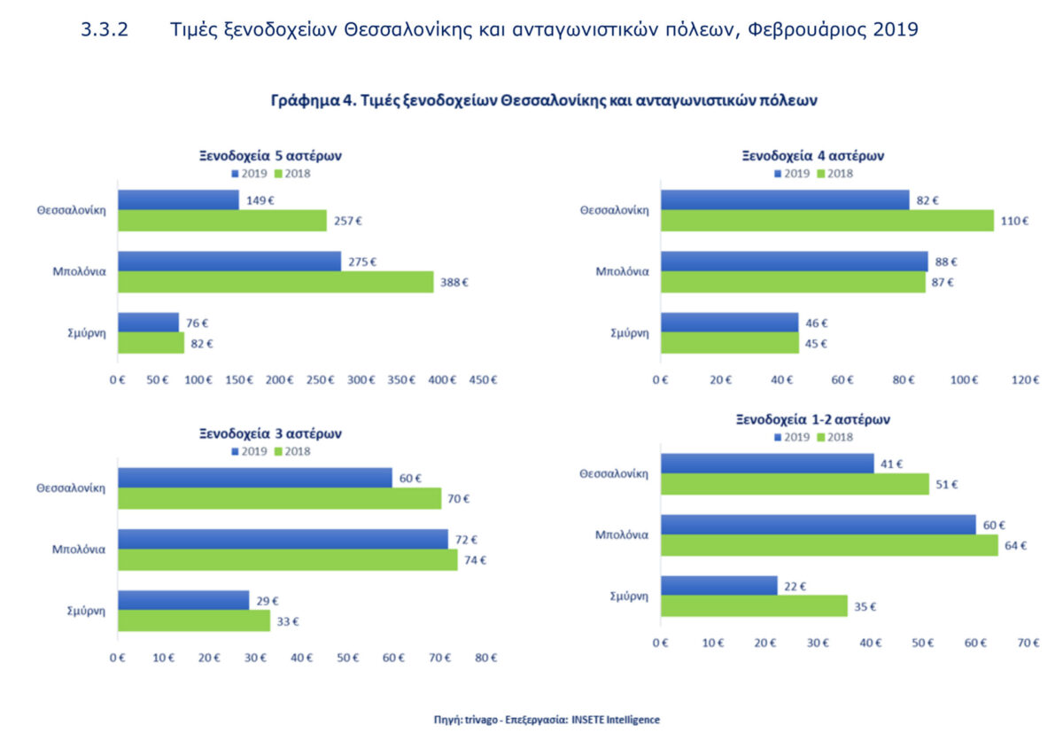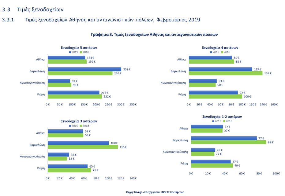 Για την Ελλάδα η κύρια αγορά τον Ιανουάριο του 2019 ήταν η Γερμανία και ακολουθεί η Βρετανία και η Ιταλία. Στην τέταρτη θέση η Γαλλία και στην έκτη οι ΗΠΑ. Οι τιμές, παρά τις ανοδικές τάσεις, σύμφωνα με στοιχεία της trivago, στους περισσότερους προορισμούς είναι σε ανταγωνιστικά επίπεδα, συγκρινόμενες με τις τιμές των ξενοδοχειακών μονάδων αντίστοιχων προορισμών του εξωτερικού.