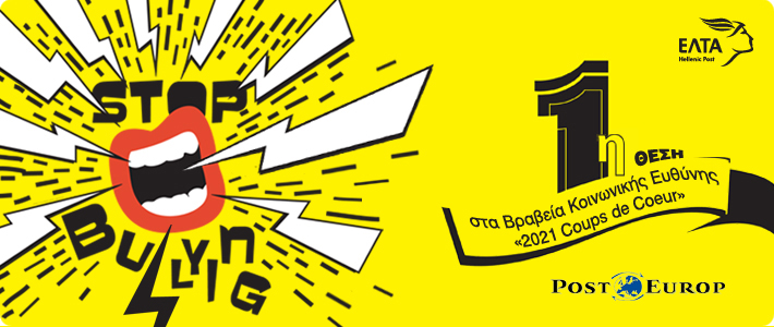 Το βραβείο «Coup de Coeur 2021» της PostEurop απονεμήθηκε φέτος στα ΕΛΤΑ για τη δράση κοινωνικής ευθύνης «Stop Bullying». Τα βραβεία «Coups de Coeur» αποτελούν την ετήσια επιβράβευση των βέλτιστων πρακτικών κοινωνικής ευθύνης των ταχυδρομικών φορέων της Ευρώπης στις κατηγορίες «Κοινωνία», «Ανθρώπινο Δυναμικό» και «Περιβάλλον».