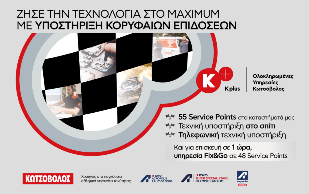 Η Κωτσόβολος, κορυφαίος προορισμός τεχνολογίας παρουσιάζει τη νέα καμπάνια της για τις Ολοκληρωμένες Υπηρεσίες K+, εμπνευσμένη από το EKO Αcropolis Rally 2022, το κορυφαίο αθλητικό γεγονός που στηρίζει ως επίσημος χορηγός για 2η χρονιά, όπου η άρτια και ολοκληρωμένη τεχνική υποστήριξη αποτελεί προϋπόθεση για τη μοναδική εμπειρία θεάματος που μας προσφέρει.