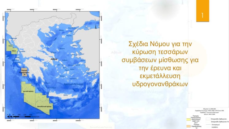Με την κατάθεση των τεσσάρων νομοσχεδίων μέσω των οποίων θα κυρωθούν ισάριθμες συμβάσεις μίσθωσης για την παραχώρηση των δικαιωμάτων έρευνας και εκμετάλλευσης υδρογονανθράκων σε τέσσερις θαλάσσιες περιοχές σε Κρήτη και Ιόνιο. Πιο συγκεκριμένα: