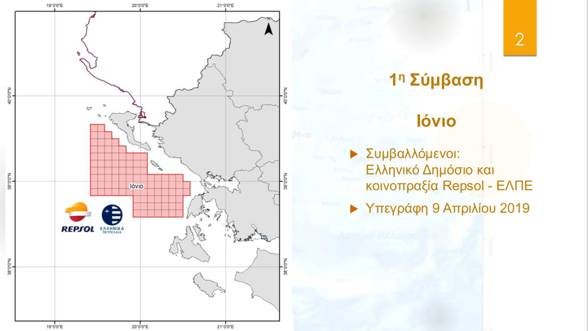 Για τη θαλάσσια περιοχή «Ιόνιο» (Δυτική Ελλάδα) εισάγεται προς κύρωση η σύμβαση που υπεγράφη στις 9 Απριλίου 2019 μεταξύ του Ελληνικού Δημοσίου και της κοινοπραξίας Repsol-Ελληνικά Πετρέλαια.