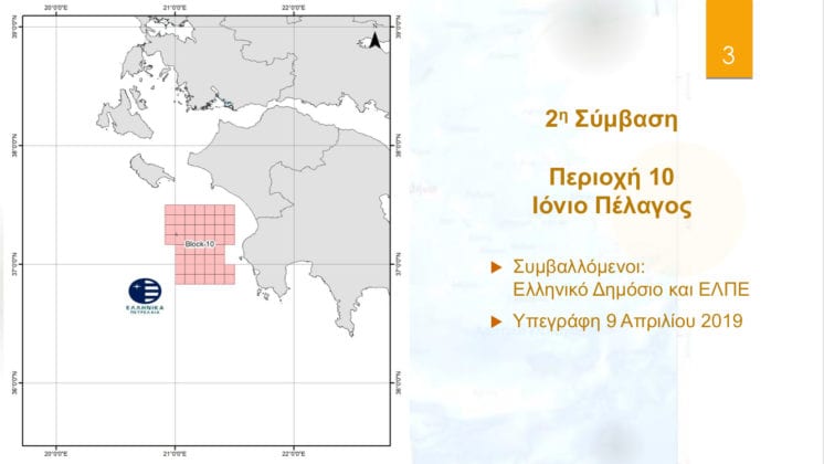 - Για τη θαλάσσια περιοχή «Ιόνιο» στη Δυτική Ελλάδα, η προς κύρωση σύμβαση υπεγράφη στις 9 Απριλίου 2019 μεταξύ του Ελληνικού Δημοσίου και της κοινοπραξίας Repsol-Ελληνικά Πετρέλαια. Την ίδια ημέρα υπεγράφη και η προς κύρωση σύμβαση για την «Περιοχή 10 Ιόνιο Πέλαγος» (στον κόλπο της Κυπαρισσίας), μεταξύ του Ελληνικού Δημοσίου και των Ελληνικών Πετρελαίων.