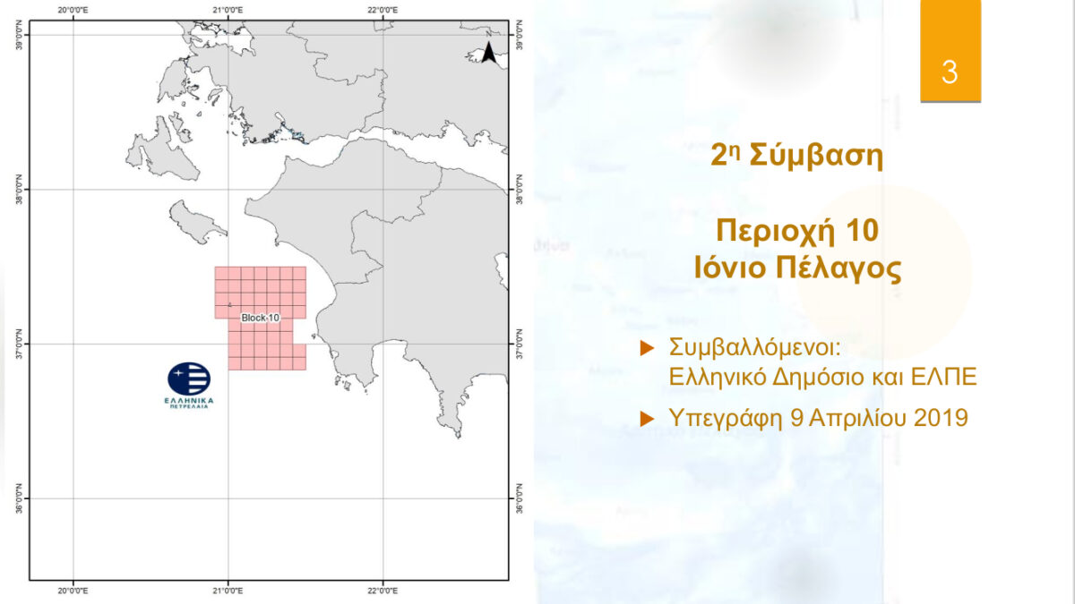 Για τη θαλάσσια περιοχή «Περιοχή 10 Ιόνιο Πέλαγος» (Κόλπος Κυπαρισσίας) εισάγεται προς κύρωση η σύμβαση που υπεγράφη στις 9 Απριλίου 2019 μεταξύ του Ελληνικού Δημοσίου και των Ελληνικών Πετρελαίων.