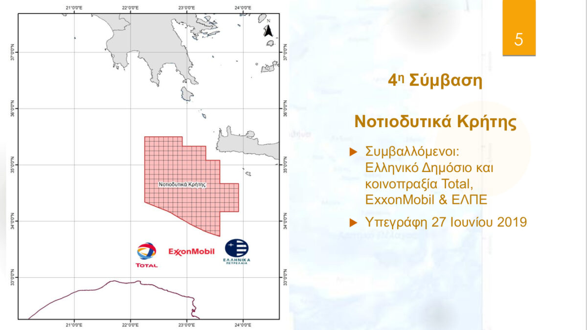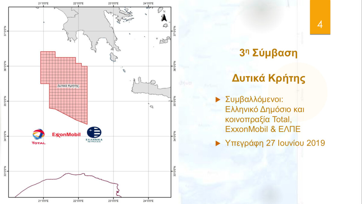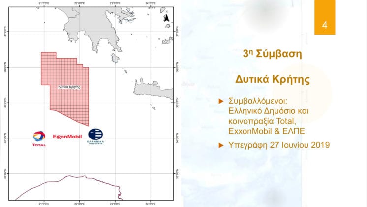 - Για τις θαλάσσιες περιοχές «Νοτιοδυτικά Κρήτης» και «Δυτικά Κρήτης» εισάγονται προς κύρωση οι δυο συμβάσεις που υπεγράφησαν στις 27 Ιουνίου 2019 μεταξύ του Ελληνικού Δημοσίου -εκπροσωπούμενο από τον υπουργό Περιβάλλοντος και Ενέργειας και την Ελληνική Διαχειριστική Εταιρεία Υδρογονανθράκων (ΕΔΕΥ)- και της κοινοπραξίας Total, ExxonMobil και Ελληνικών Πετρελαίων.