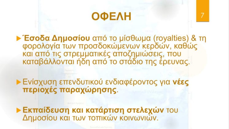 Το Ελληνικό Δημόσιο δεν επιμερίζεται τον κίνδυνο της επένδυσης, αφού το κόστος των μελετών, ερευνητικών και παραγωγικών γεωτρήσεων επιβαρύνει αποκλειστικά τις εταιρείες, ενώ στις σχετικές συμβάσεις προβλέπεται, στην ολοκλήρωση της φάσης των ερευνών, η αποδέσμευση των μη εκμεταλλεύσιμων περιοχών από τις εταιρίες – αναδόχους. Επιπροσθέτως, τα έσοδα του Δημοσίου είναι εξασφαλισμένα, αφού προβλέπεται ελάχιστο πρόγραμμα εργασιών και οικονομική δέσμευση με έκδοση αντίστοιχης εγγυητικής επιστολής.