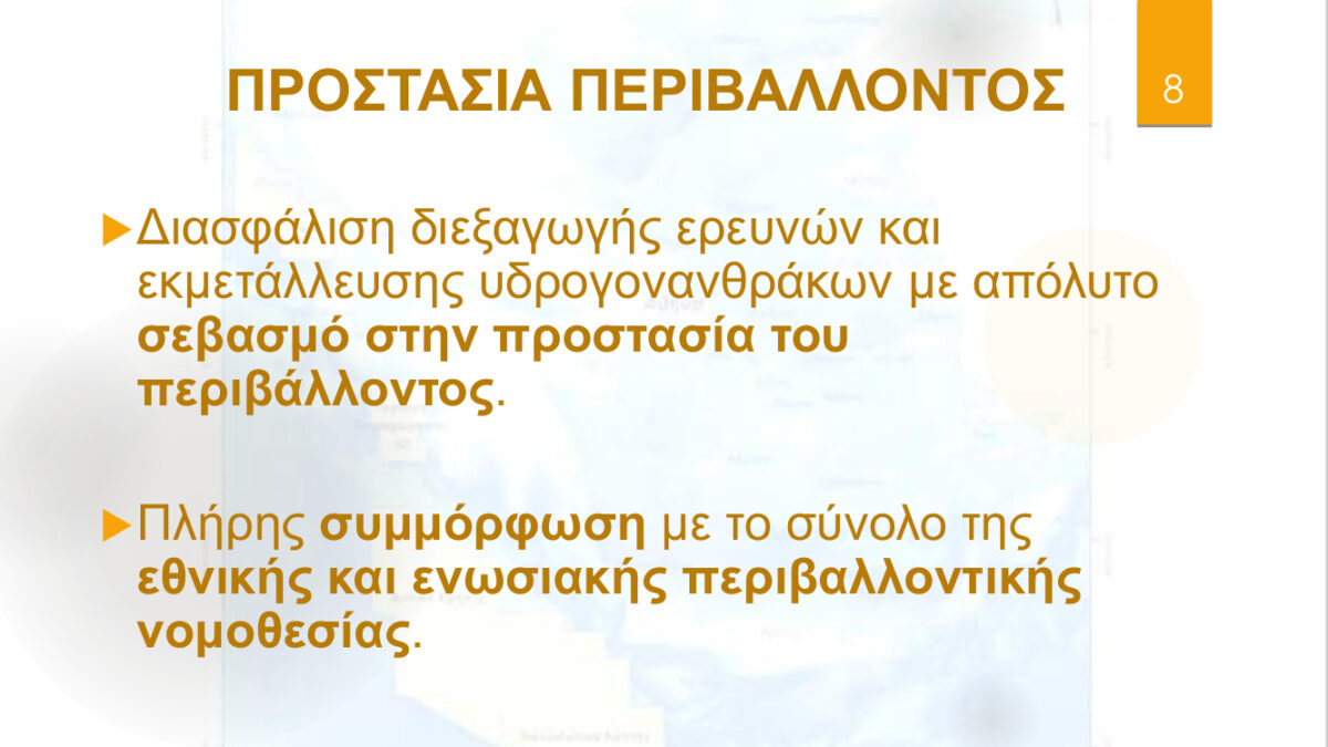 Όλες οι συμβάσεις μίσθωσης περιλαμβάνουν αυστηρό πλέγμα διατάξεων που διασφαλίζει ότι η έρευνα και η εκμετάλλευση υδρογονανθράκων θα διεξαχθεί με απόλυτο σεβασμό στην προστασία του περιβάλλοντος.