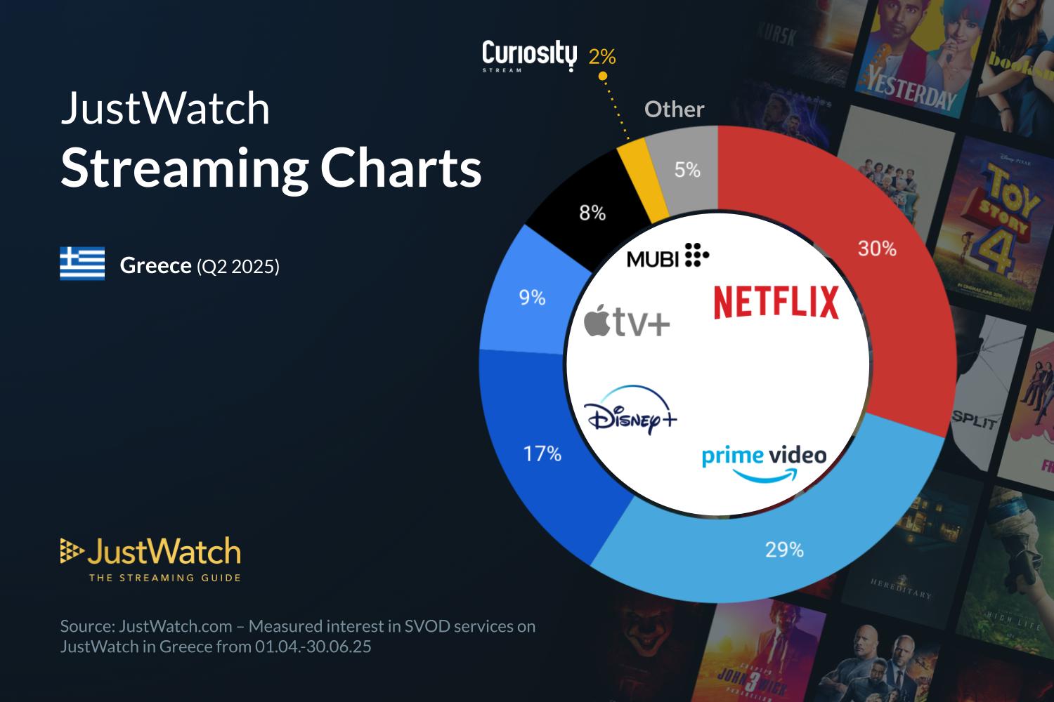 Η cinephile πλατφόρμα MUBI ακολουθεί με 8%, ενώ η CuriosityStream περιορίζεται στο 2%, με σταθερή μεν αλλά πολύ περιορισμένη βάση χρηστών. Πρόκειται για υπηρεσίες που παίζουν τον ρόλο της «δεύτερης συνδρομής» για πιο στοχευμένα κοινά.