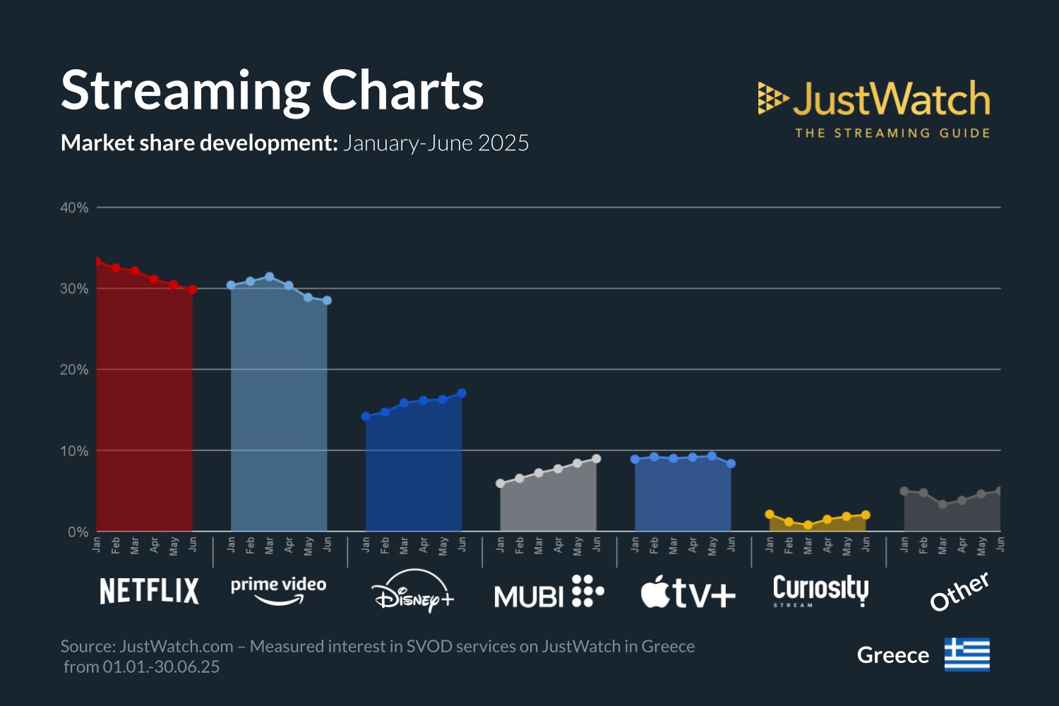 Η ελληνική αγορά video-on-demand βρίσκεται πλέον σε τροχιά έντονου ανταγωνισμού, με τις διεθνείς πλατφόρμες να δίνουν σκληρή μάχη για την κατάκτηση της πρώτης θέσης. Σύμφωνα με τα τελευταία διαθέσιμα στοιχεία για το β’ τρίμηνο του 2025, το Netflix εξακολουθεί να ηγείται με 30% μερίδιο αγοράς, ωστόσο η Prime Video της Amazon βρίσκεται μόλις μία μονάδα πίσω (29%), δημιουργώντας ένα ντέρμπι κορυφής που δύσκολα θα μείνει αναλλοίωτο στο τρίτο τρίμηνο.