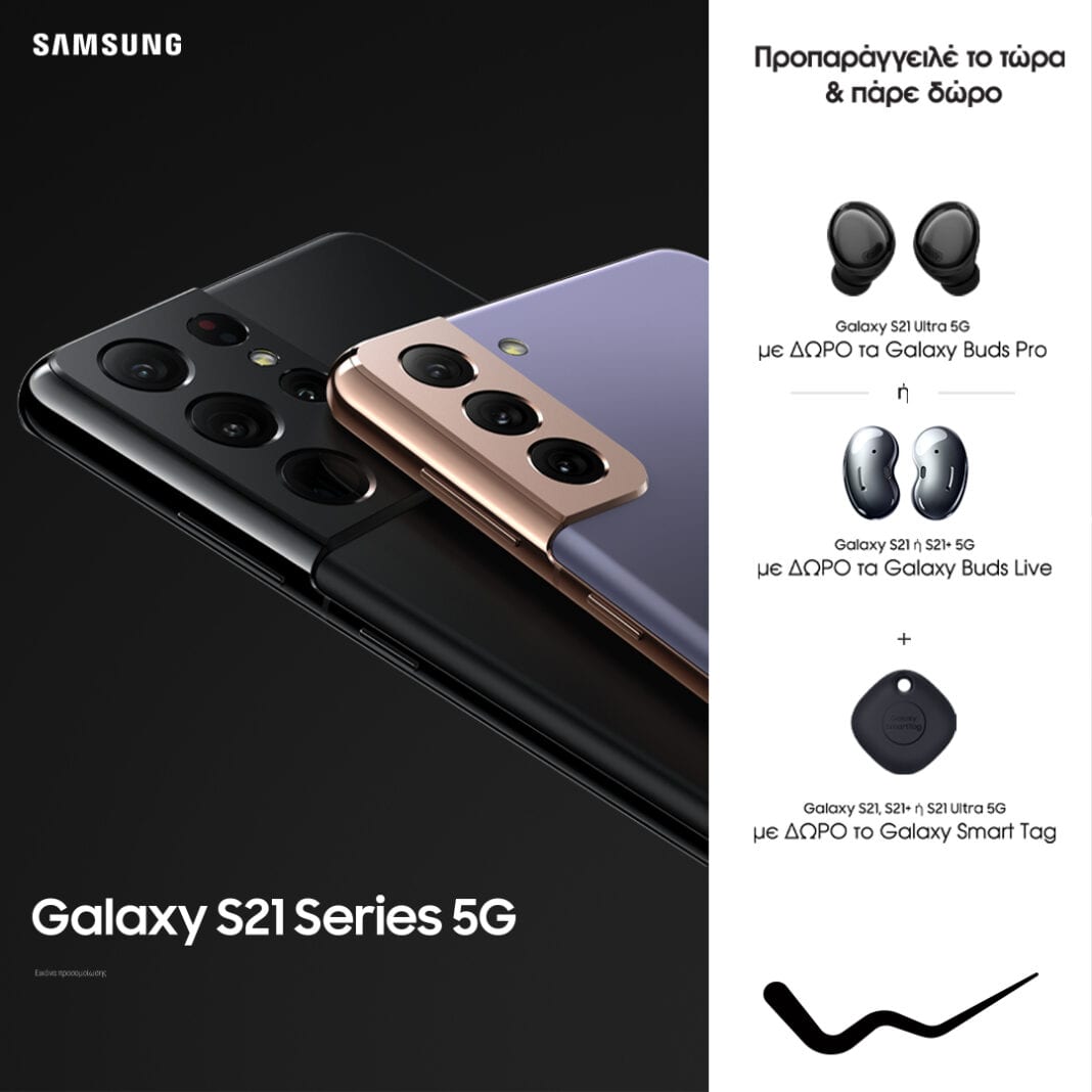 - να προπαραγγείλουν το Galaxy S21 5G ή το Galaxy S21+ 5G και να πάρουν δώρο τα Galaxy Buds Live και το Galaxy Smart Tag