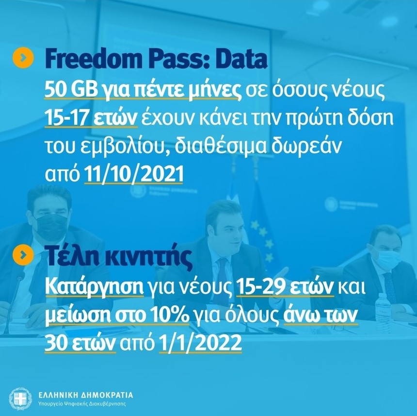 Εξειδικεύοντας τα μέτρα που ανακοίνωσε ο Πρωθυπουργός, Κυριάκος Μητσοτάκης στην ομιλία του στη ΔΕΘ και αφορούν στις τηλεπικοινωνίες, ο κ. Πιερρακάκης ανέλυσε ότι το «Freedom Pass: data» είναι ένα πακέτο 50 GB για δωρεάν χρήση διαδικτύου, το οποίο απευθύνεται σε κάθε νέα ή νέο ηλικίας 15 έως 17 ετών που έχει κάνει τουλάχιστον την πρώτη ή τη μοναδική δόση του εμβολίου. Θα έχει διάρκεια 5 μηνών από την ενεργοποίηση του και κάθε μήνα μπορούν να χρησιμοποιηθούν μέχρι 10 GB.