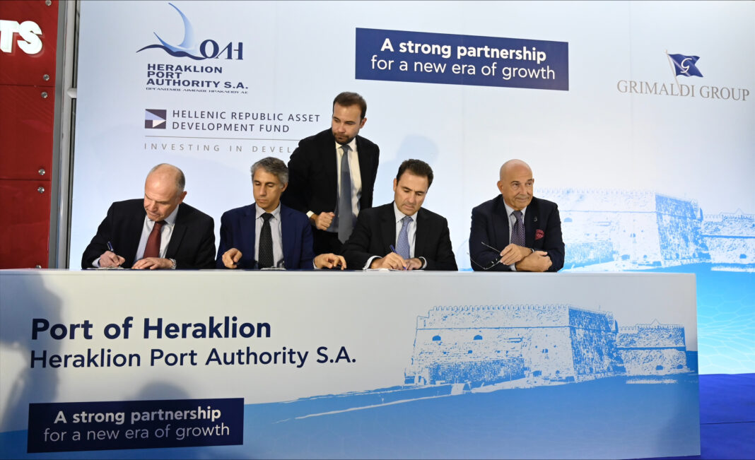 Η υπογραφή της συμφωνίας για τη μεταβίβαση των μετοχών και την καταβολή του τιμήματος πραγματοποιήθηκε στις εγκαταστάσεις της ΟΛΗ Α.Ε. στο Ηράκλειο Κρήτης, παρουσία του Υπουργού Εθνικής Οικονομίας και Οικονομικών, Κωστή Χατζηδάκη, του Υπουργού Ναυτιλίας και Νησιωτικής Πολιτικής, Χρήστου Στυλιανίδη, του Α Αντιπροέδρου της Βουλής των Ελλήνων, Γιάννη Πλακιωτάκη, του Θεοφιλέστατου Επισκόπου Κνωσσού, Μεθόδιου, του Περιφερειάρχη Κρήτης, Σταύρου Αρναουτάκη, του Δημάρχου Ηρακλείου, Αλέξη Καλοκαιρινού, του Διευθύνοντος Συμβούλου του ΤΑΙΠΕΔ, Δημήτρη Πολίτη, του Προέδρου και Διευθύνοντος Συμβούλου της Grimaldi Euromed S.p.A., Emanuele Grimaldi, του Διευθύνοντος Συμβούλου των Μινωικών Γραμμών, Λουκά Σιγάλα, του Προέδρου και Διευθύνοντος Συμβούλου της εταιρείας «Συμμετοχές Λιμένος Ηρακλείου Α.Ε.», Paul Kyprianou, του Concessions Senior Manager του Growthfund, Δημήτρη Κωνσταντακόπουλου, του Διευθύνοντος Συμβούλου της ΟΛΗ Α.Ε., Μηνά Παπαδάκη, του Προέδρου του Διοικητικού Συμβουλίου της ΟΛΗ Α.Ε., Ιωάννη Βαρδαβά, και στελεχών του ΤΑΙΠΕΔ.