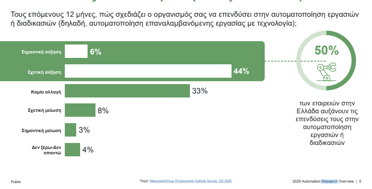 Στην Ελλάδα, η δυναμική είναι εξίσου έντονη. Μία στις δύο επιχειρήσεις (50%) δηλώνει πρόθεση αύξησης των επενδύσεων στην αυτοματοποίηση τους επόμενους δώδεκα μήνες -με 6% να προβλέπει «σημαντική» και 44% «σχετική» αύξηση, ενώ 33% το σκοπεύει να διατηρήσει σταθερές τις δαπάνες.