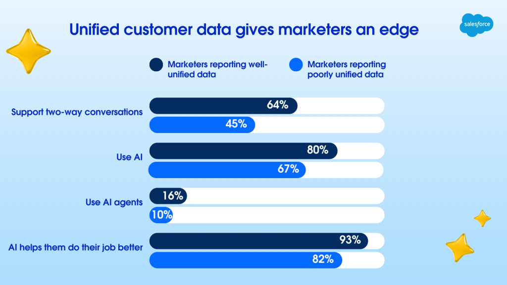 Αναλυτικότερα, με βάση τις απαντήσεις στην έρευνα, το 83% των marketers επιβεβαιώνει ότι το κοινό αναμένει άμεσες, εξατομικευμένες απαντήσεις και εμπειρίες που ανταποκρίνονται στις πραγματικές του ανάγκες. Παρόλα αυτά, το 69% των επαγγελματιών δηλώνει ότι δεν έχει τη δυνατότητα να απαντήσει άμεσα σε μηνύματα των πελατών, εξαιτίας της έλλειψης αξιοποιήσιμων δεδομένων. Μάλιστα, μόνο το 58% των στελεχών αναφέρει πως έχει πλήρη πρόσβαση σε δεδομένα εξυπηρέτησης και το 56% σε δεδομένα πωλήσεων. Στον αντίποδα, οι marketers που έχουν πρόσβαση σε ενοποιημένα δεδομένα έχουν 42% περισσότερες πιθανότητες να ανταποκριθούν ταχύτερα στα μηνύματα των πελατών τους, αλλά και 60% περισσότερες πιθανότητες να χρησιμοποιήσουν AI agents για τη βελτιστοποίηση των «επιδόσεών» τους.