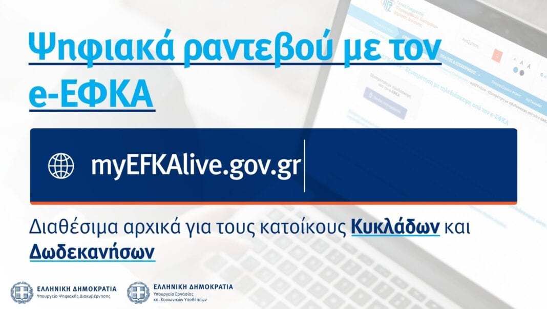 Στη γεωγραφική επέκταση του myEFKAlive προχωρούν τα Υπουργεία Εργασίας και Κοινωνικών Υποθέσεων και Ψηφιακής Διακυβέρνησης. Ειδικότερα, η δυνατότητα εξ αποστάσεως εξυπηρέτησης του πολίτη από υπάλληλο του e-ΕΦΚΑ μέσω βιντεοκλήσης καλύπτει πλέον γεωγραφικά τους κατοίκους περιοχών που βρίσκονται στις Περιφέρειες Ανατολικής Μακεδονίας και Θράκης και Θεσσαλίας. Συγκεκριμένα, στο myEFKAlive εντάσσονται οι περιοχές: