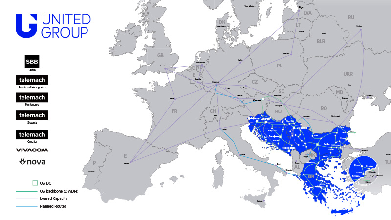 Το δίκτυο τηλεπικοινωνιών της United Group εκτείνεται σε όλη την Ευρώπη, καλύπτοντας την Ολλανδία, τη Γερμανία, την Αυστρία, τη Σλοβενία, την Κροατία, τη Βοσνία & Ερζεγοβίνη, τη Σερβία, τη Βουλγαρία, το Μαυροβούνιο και την Ελλάδα.