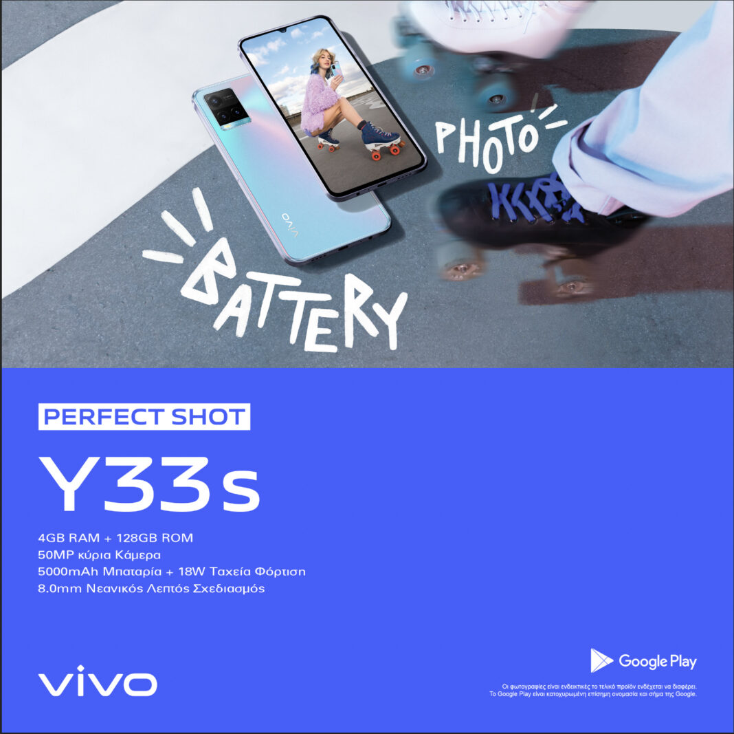 Με στόχο την παροχή ανώτερης εμπειρίας για καθημερινή χρήση και ψυχαγωγία, το vivo Y33s ανταποκρίνεται στις προσδοκίες των χρηστών για εξαιρετική απόδοση Κάμερας και 8GB + 4GB επέκταση RAM και Fashion Σχεδιασμό. Διαθέτει σύστημα τριπλής κάμερας με κύρια κάμερα 50MP, παρέχοντας το κατάλληλο σετ στους καταναλωτές για να καταγράφουν τις αναμνήσεις τους.